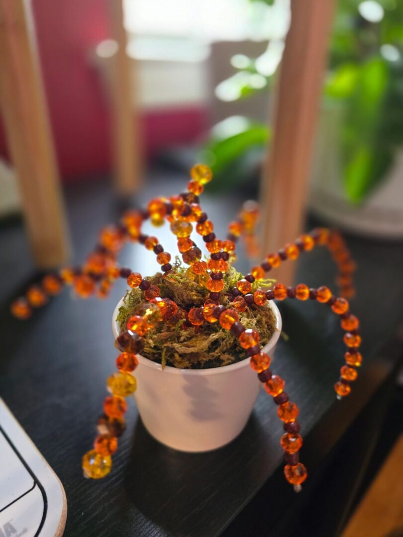 A handcrafted beaded succulent featuring warm orange and yellow tones, set in a moss‑filled pot for a natural, earthy look. A cheerful, maintenance‑free accent for any space.