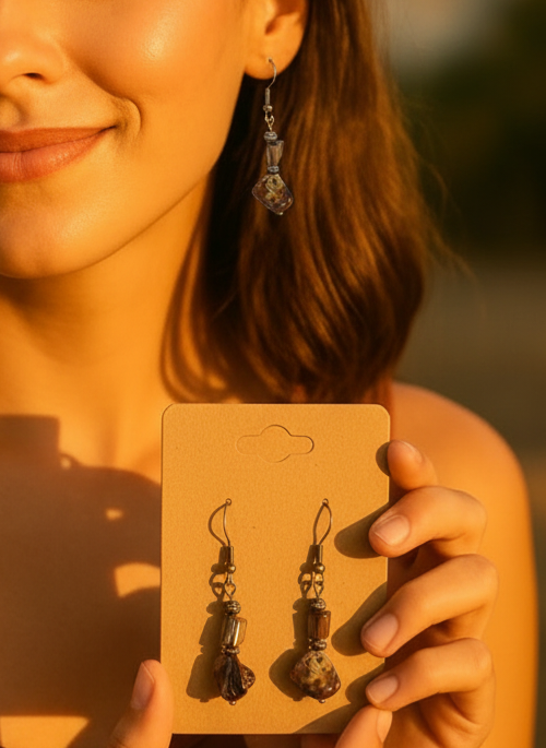 Handcrafted with sunset-inspired warmth, these earrings feature a textured metallic bead, a rich amber accent, and a faceted crystal-like drop that catches the light with every movement. The layered design offers a graceful silhouette and earthy elegance, perfect for boho lovers and nature-inspired wardrobes.