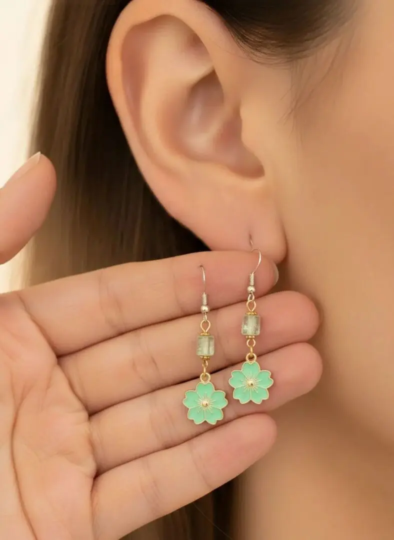 Add a touch of elegance with these boho earrings, featuring translucent cylindrical beads and delicate green flower charms outlined in gold tone. Lightweight and stylish, they’re perfect for both everyday wear and special occasions.
