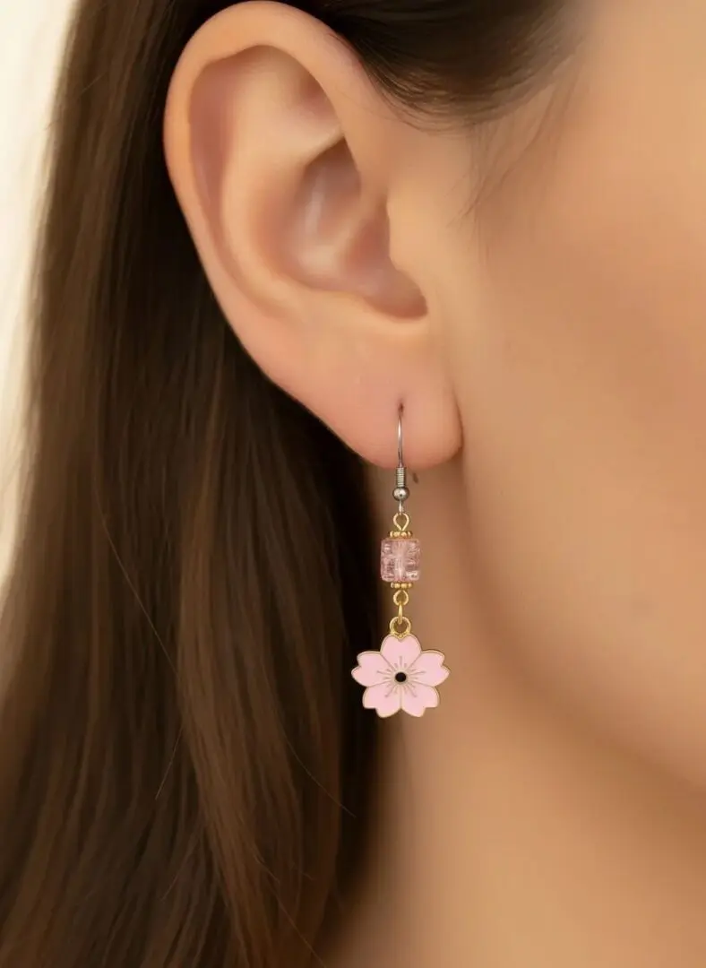 Sweet and feminine, these earrings feature a translucent pink cube bead and a delicate pink flower charm with a dark center, all suspended from a silver hook. A soft pop of color perfect for spring-inspired or boho looks.