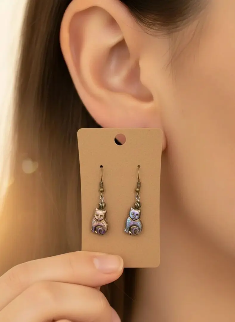 Playful and enchanting, these handcrafted earrings feature iridescent cat-shaped charms in swirling shades of purple, blue, and gold. With curled tails and antique-style hooks accented by decorative beads, they bring a touch of magic and personality to any outfit. Perfect for cat lovers and free spirits alike.