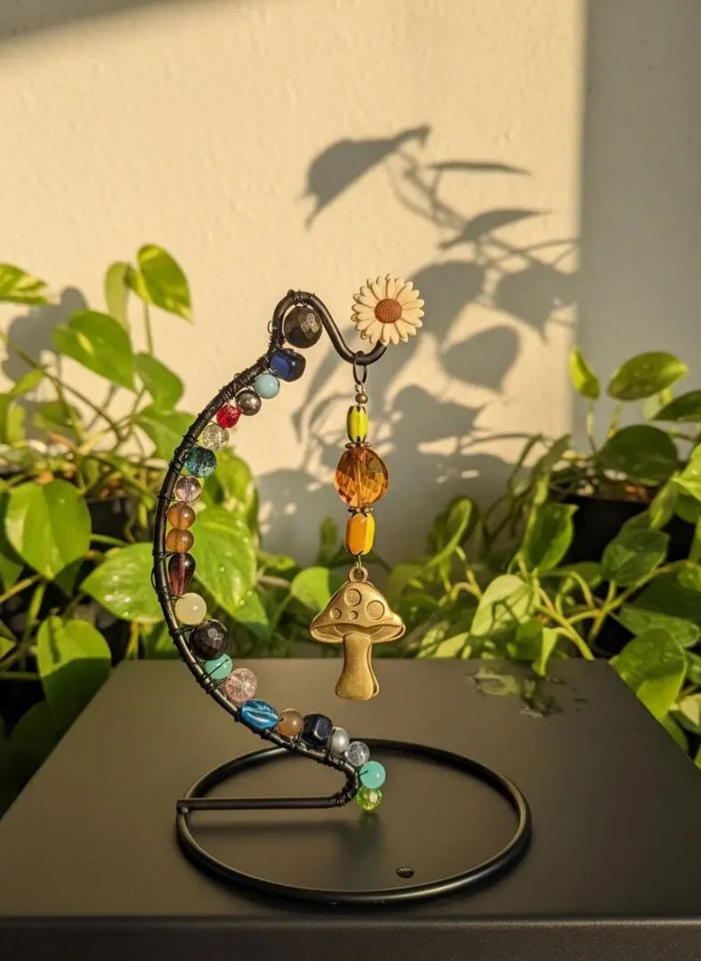 This beaded ornament stand is artistically wrapped with a vibrant mix of beads and charms. The mushroom shape is doubled with 2 charms for beauty from both sides. This stand is wrapped in an eclectic array of beads in glossy, matte, and faceted finishes. A standout daisy charm with cream petals and a brown center sits near the top, accompanied by warm-toned yellow and orange beads. At the center, a metallic mushroom charm adds a whimsical touch. A perfect Boho piece for a tabletop, desktop, or anywhere you want to add some artistic charm.