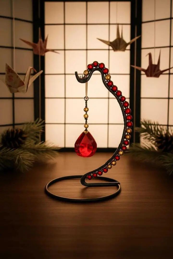 This ornament stand brings an artistic touch to any display space. It features alternating red and gold beads that add warmth and visual interest. A faceted 1” red sphere hangs at the end of the curve, creating a striking focal point that catches the light beautifully.