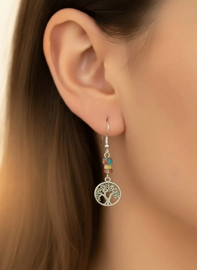 Vibrant and earthy, these earrings feature three stacked multicolored beads above a silver Tree of Life charm. Their rich tones and symbolic design offer a bold yet grounded accent for boho and nature-inspired styles.