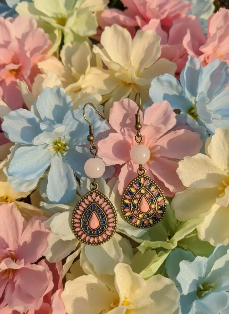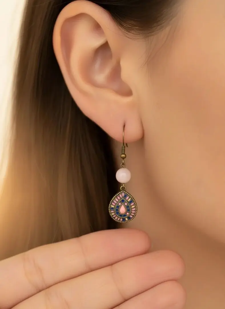 A celebration of asymmetry and artistry, this handcrafted pair features two distinct yet harmoniously matched designs. Each earring showcases a soft pink teardrop gem framed in bronze filigree, accented with pastel stones and a single white bead. Though uniquely styled, they mirror each other in tone and spirit—perfect for those who love boho flair with a twist of individuality.
