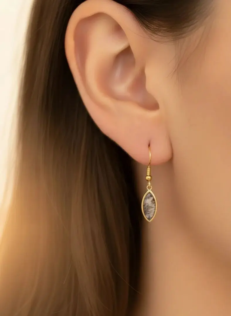 Graceful and grounded, these handcrafted earrings feature a marquise-shaped pendant with soft gray and white marbling, framed in warm gold tones. A small bronze bead adds vintage texture above the drop, creating a balanced silhouette that’s both understated and artful. Lightweight and versatile, they’re ideal for everyday wear or adding a quiet statement to your boho ensemble.
