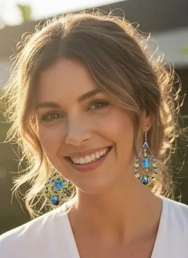 These handcrafted earrings feature a stunning teardrop design adorned with blue and green gemstones arranged in a floral-inspired pattern. The intricate setting evokes the freshness of a garden in bloom, while the bold size and rich colors make them a standout accessory. Lightweight yet eye-catching, they’re perfect for adding a touch of boho elegance to any outfit