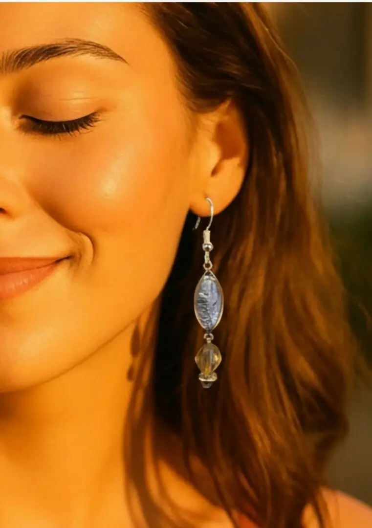 Handcrafted with soft contrast and elegant simplicity, these earrings feature a textured blue oval bead paired with a faceted amber-toned drop. The combination of cool and warm hues creates a balanced, earthy look, while antique gold findings add a vintage touch. Lightweight and versatile, they’re perfect for adding a subtle pop of color to your boho-inspired wardrobe.