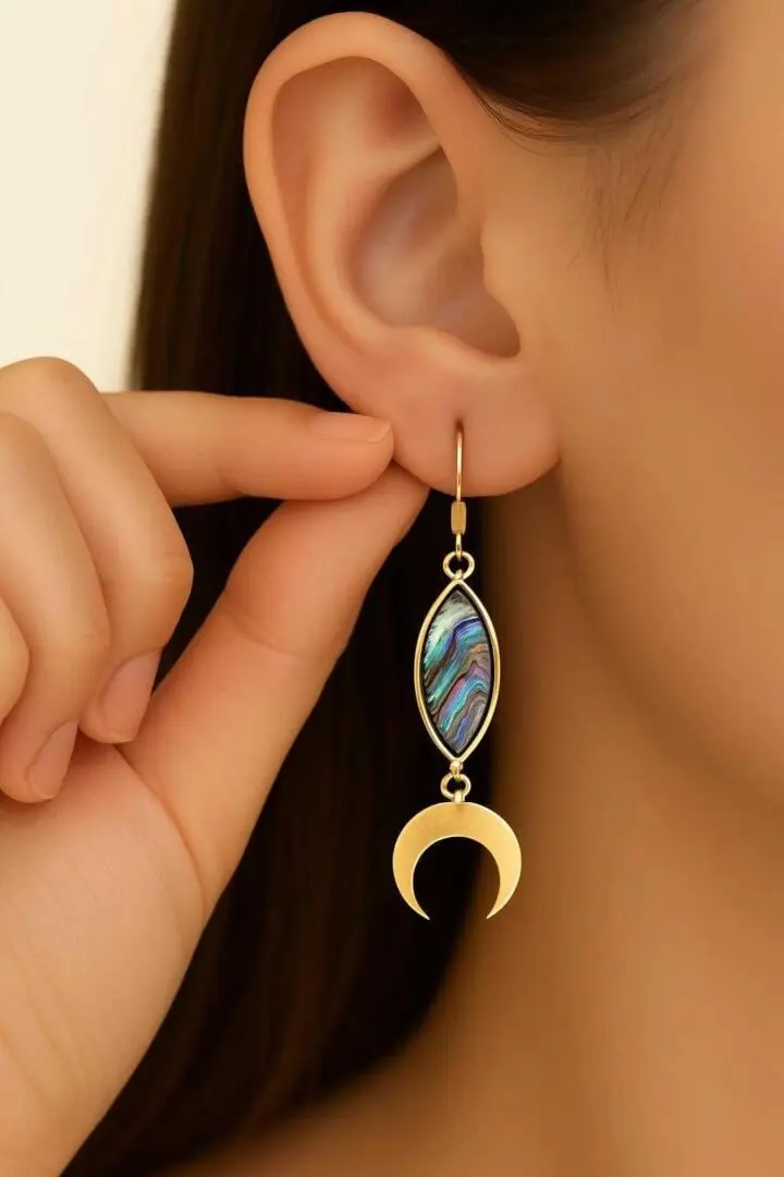 Handcrafted with cosmic flair, these earrings feature a marquise-shaped abalone-style bead shimmering with blues, greens, and purples, paired with a golden crescent moon charm below. The combination evokes a dreamy, boho vibe—perfect for moon lovers, stargazers, and anyone drawn to nature’s mystique.