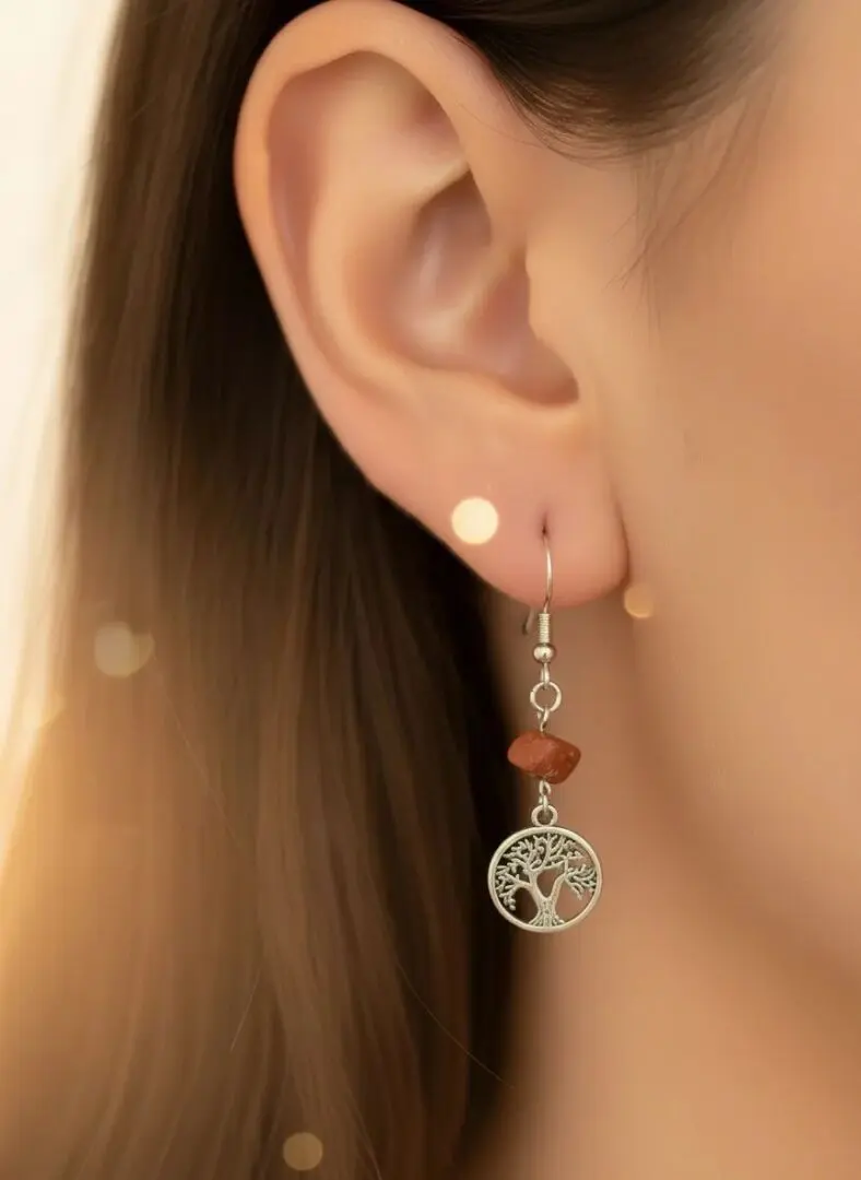 Earthy and elegant, these earrings feature a warm reddish-brown stone bead and a circular metallic pendant with a Tree of Life design. Symbolizing growth and nature, they offer a meaningful accent with boho charm.