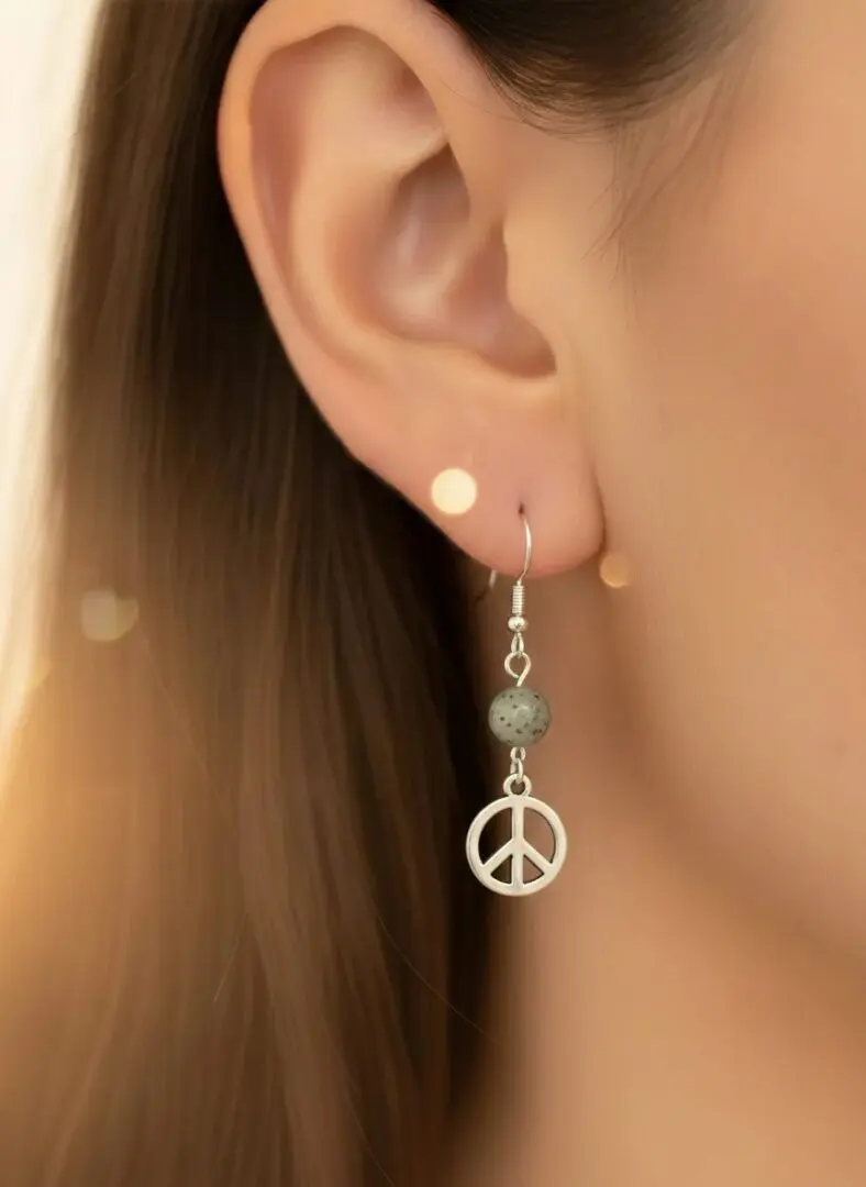 Minimalist and meaningful, these earrings feature a classic silver peace symbol charm suspended from a simple hook with a metallic bead accent. A timeless design that speaks to harmony and effortless boho style