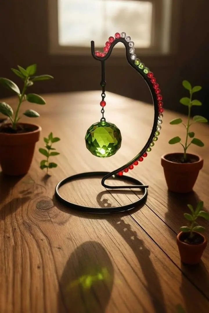 Spruce up your holiday décor with this charming beaded wire ornament stand, adorned with a 1” green prism and festive beads—perfect for the season!