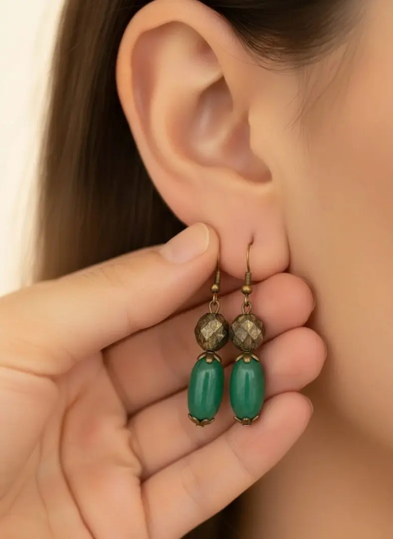 These handcrafted earrings blend antique elegance with natural warmth. Featuring a faceted bronze bead paired with a smooth, oval green drop, each element is suspended from brass-toned findings for a timeless, earthy look. Lightweight and versatile, they’re perfect for adding a subtle pop of color to your boho-inspired wardrobe.