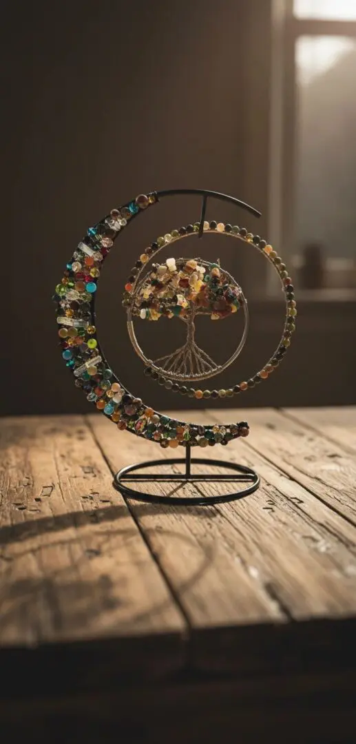 This piece is a handcrafted wire tree sculpture nestled in a crescent moon frame, and it’s adorned with vibrant beads and natural stones to add an extra touch of earthy elegance.