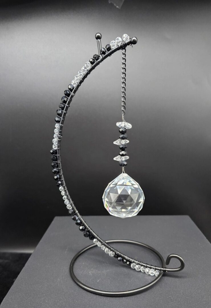 A graceful hanging prism that sparkles beautifully from its curved black stand, finished with black and clear beads for a touch of charm.