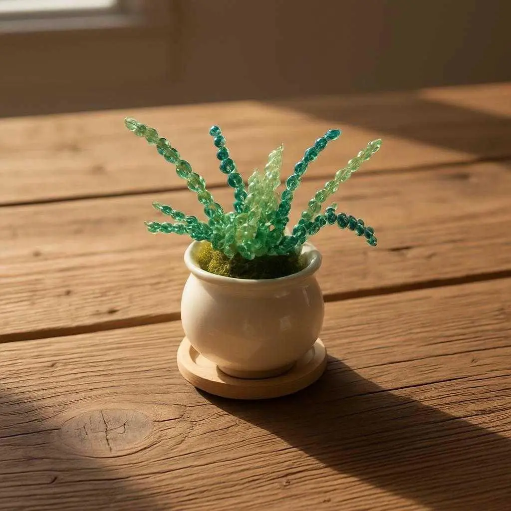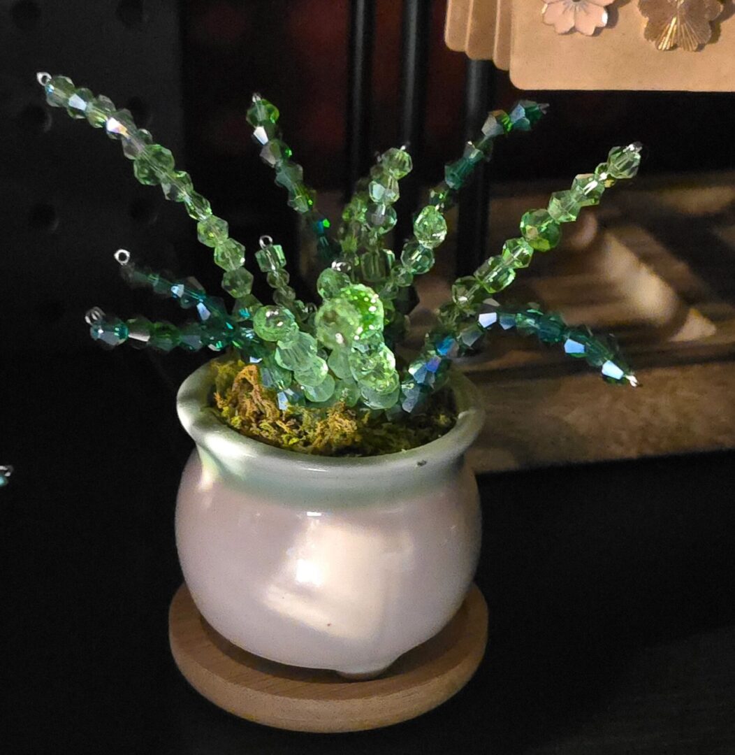 A sparkling plant handcrafted with green crystal beads, set in a ceramic pot for an everlasting touch of nature.