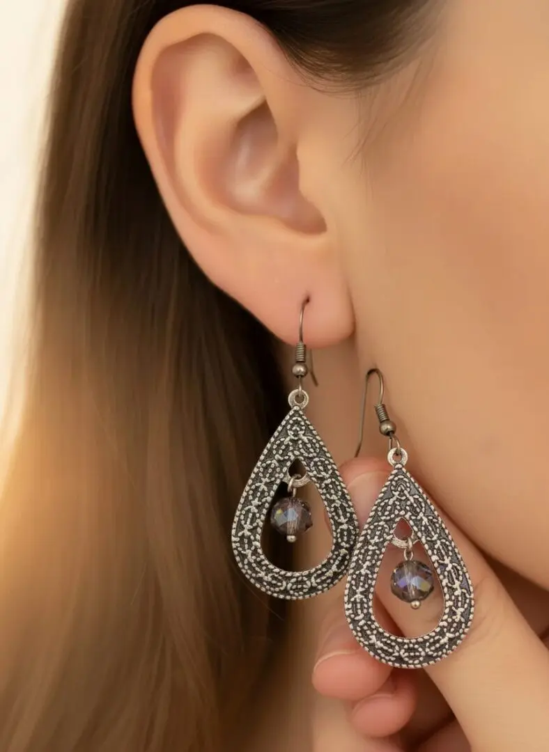 Intricately designed and full of character, these earrings feature textured metallic teardrop frames adorned with delicate beadwork. A smokey, faceted center bead adds depth and a hint of iridescent shimmer, creating a striking contrast that catches the light with every movement. Perfect for adding a touch of vintage mystique to your boho-inspired look