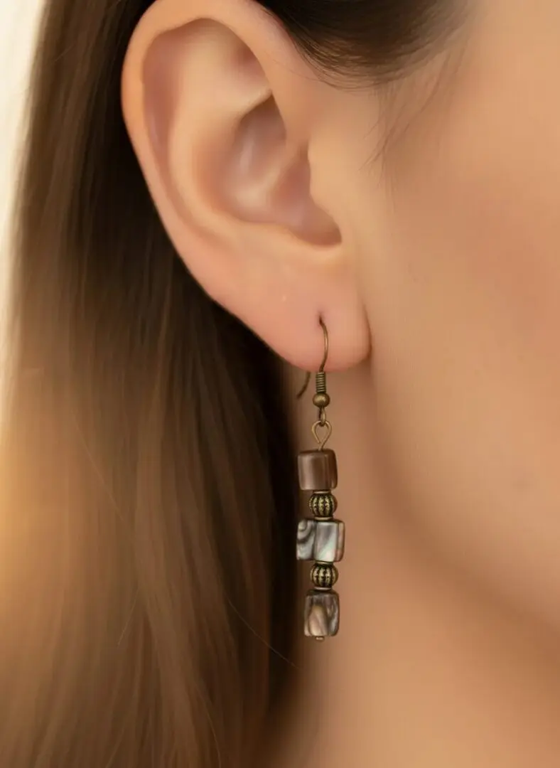 These handcrafted earrings feature a striking vertical trio: a marbled blue-green square bead, a warm amber accent, and a deep olive-toned square drop. Framed with antique gold spacers and suspended from gold-toned hooks, they offer a rich blend of color and texture. Perfect for adding a grounded, artisan-crafted touch to your boho wardrobe.