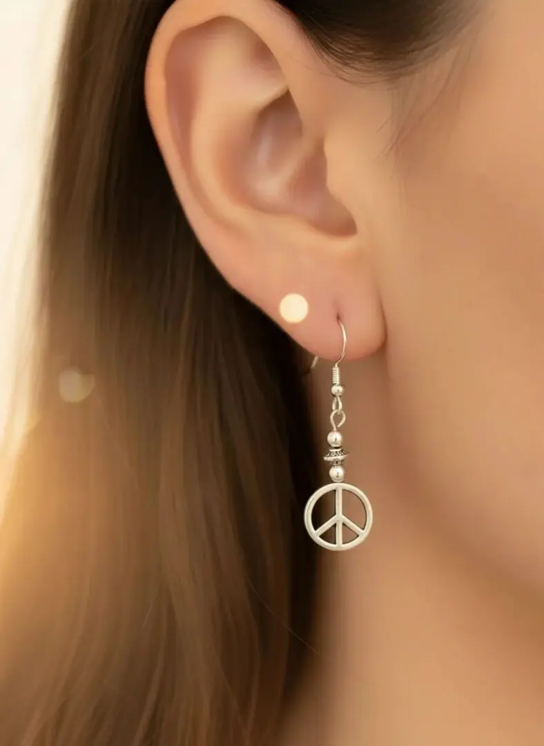 These earrings feature a dangling metallic peace symbol. The design evokes themes of harmony and countercultural style, making them both a fashion statement and a symbol of peaceful ideals.