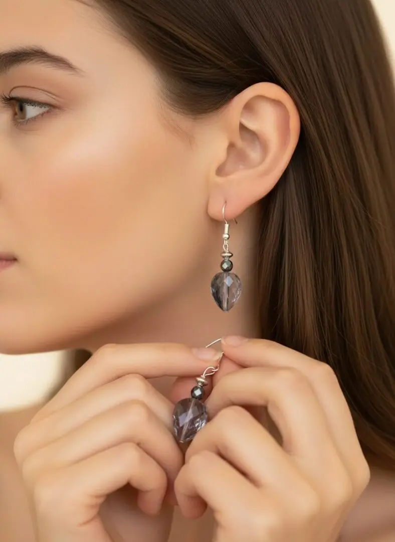 Elevate your everyday with these earrings featuring a faceted teardrop crystal in a rich, smoky hue. Suspended from silver hooks and accented with metallic and silver spacer beads, they offer a sleek, earthy shimmer that complements both casual and dressy looks. Lightweight and graceful, they’re perfect for adding a touch of mystique to your boho-inspired ensemble