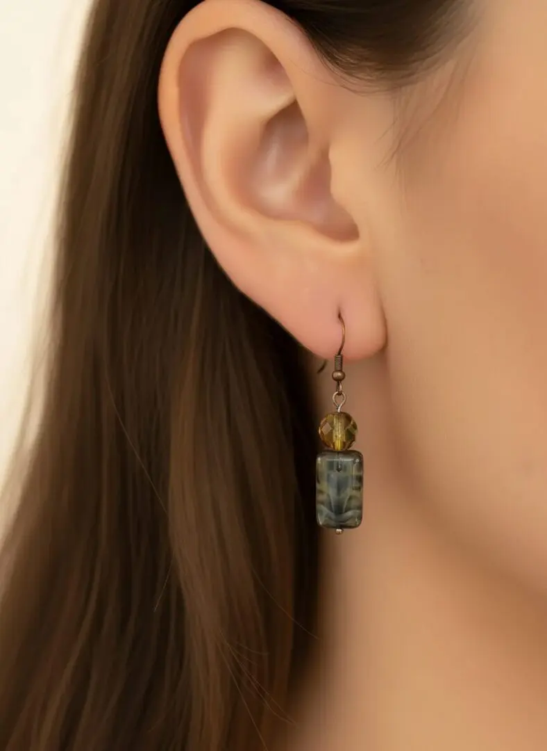 Handcrafted with contrast and character, these earrings feature a faceted amber bead paired with a marbled rectangular drop in cool blue-gray tones. The warm top bead adds a golden glow, while the bottom stone brings depth and texture. Suspended from brass-toned hooks, they offer a grounded yet luminous accent to any boho-inspired outfit.