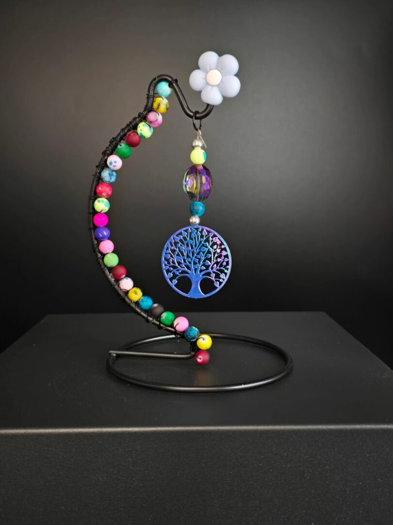Brighten any space with this handcrafted ornament featuring a playful mix of colorful beads, a delicate flower accent, and a symbolic tree of life pendant. Its artistic design and joyful palette make it a perfect touch for home décor or gifting.