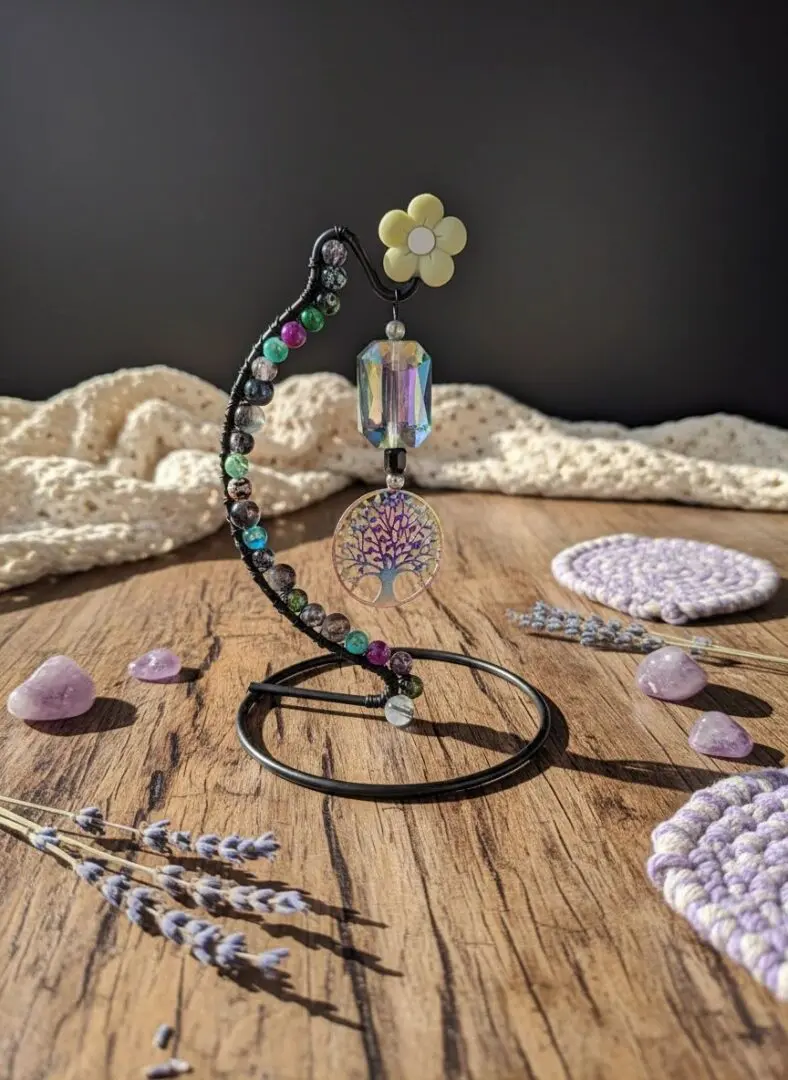 A mix of color and texture, this boho ornament stand blends earthy vibes with a touch of edge. The tree of life pendant anchors the piece with quiet strength, while the playful beads and flower add a free-spirited twist—perfect for those who like their style with soul and a bit of grit.