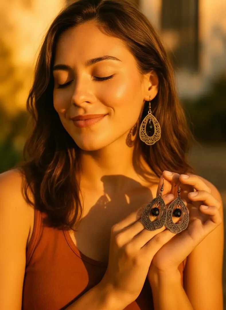 Rich in texture and timeless in style, these handcrafted earrings feature ornate teardrop frames with delicate beadwork and a suspended dark faceted center bead. The metallic detailing adds depth and vintage charm, while the central stone brings a subtle shimmer that catches the light with every movement. A perfect blend of boho and antique-inspired design for those who love statement pieces with soul.