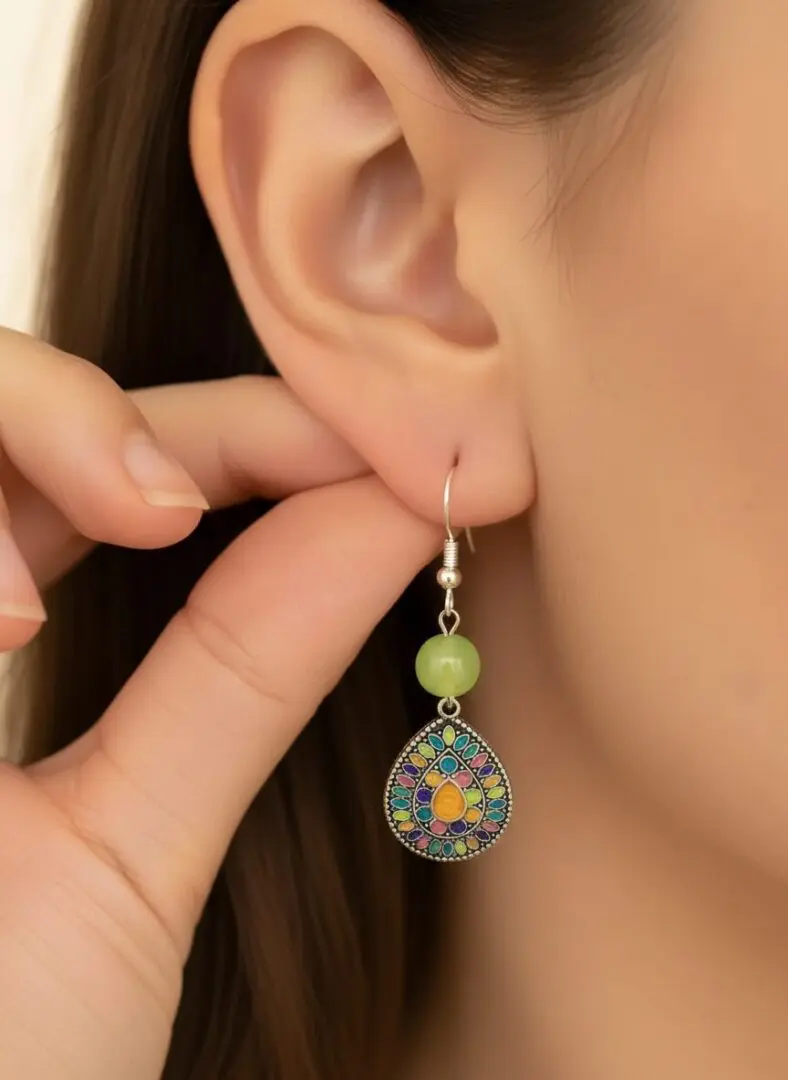 Bursting with color and intricate detail, these handcrafted earrings feature a teardrop-shaped pendant with a symmetrical petal-inspired design in vivid shades of blue, pink, yellow, and green. A central amber-toned stone anchors the pattern, while a marbled green bead adds earthy contrast above. Lightweight and full of personality, they’re perfect for adding a joyful, artistic touch to your everyday look