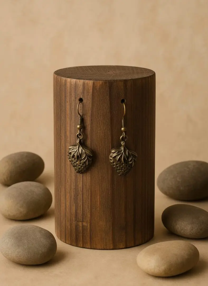 These sweet antique-bronze earrings feature delicate strawberry charms, sculpted with leafy tops and dotted berry texture for a nostalgic, storybook feel. Their earthy tone pairs beautifully with natural, cottagecore, and boho styles, adding a hint of forest magic to your everyday look. Lightweight and easy to wear, they’re perfect for farmers’ market strolls, garden days, or anyone who loves berries, botanicals, and nature-inspired jewelry.